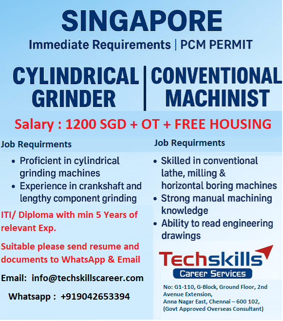 #SingaporeJobs #MachinistJobs #CylindricalGrinder #ConventionalMachinist #ManufacturingJobs #OverseasJobs #PCMpermit #TechskillsCareer #ImmediateHiring #JobsAbroad #IndianWorkersAbroad